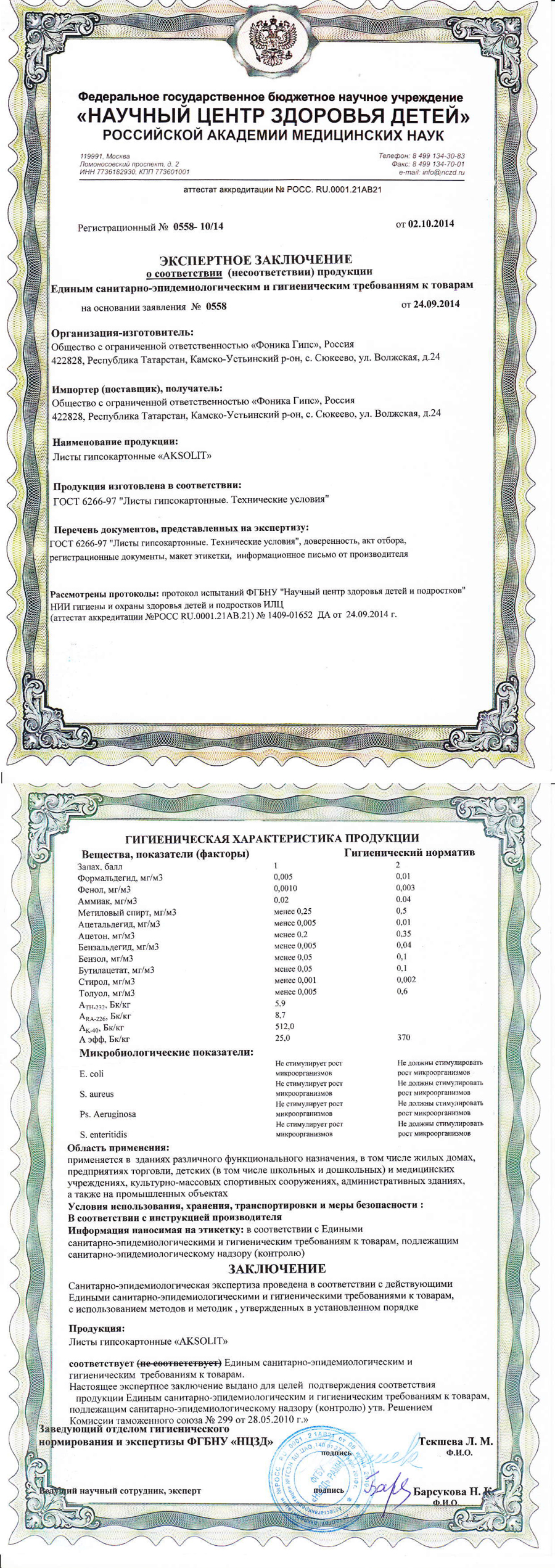 Гипсокартонные листы AKSOLIT Версия для печати Скачать документ (2,89 Мб) Экспертное заключение Научного центра здоровья детей Закрыть Закрыть